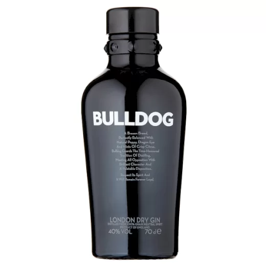 Bulldog Gin is a premium gin containing 12 botanicals. It is very smooth, less dry than most gins and is made in Britain with 100% British grain. It is quadrupled distilled and then triple filtered. 40% ABV.