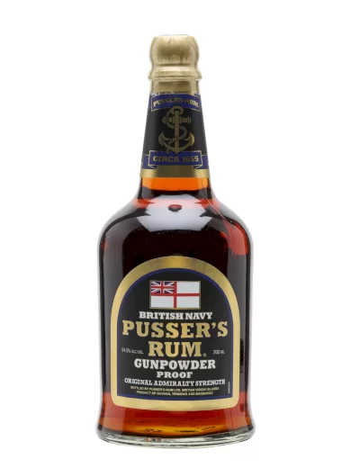 Pusser's Gunpowder rum is a clear, dark coppery amber rum with burnished copper highlights and a powerful nose of molasses, treacle and toffee, with lighter notes of honey, oak and warm spices. 54.5% ABV.