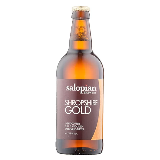Salopian's Shropshire Gold is golden with a floral aroma and a full hoppy flavour that is balanced by a crisp dry maltiness and a rich finish. It has a 3.8% ABV.